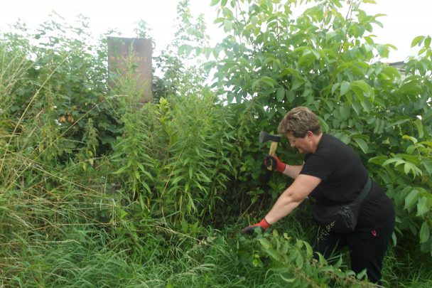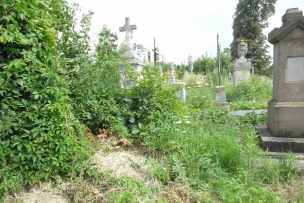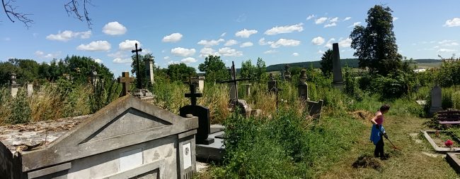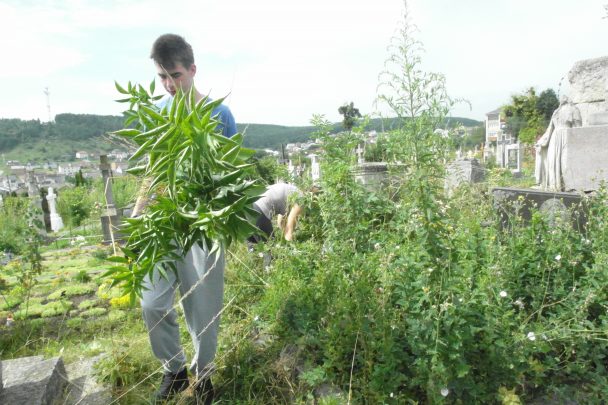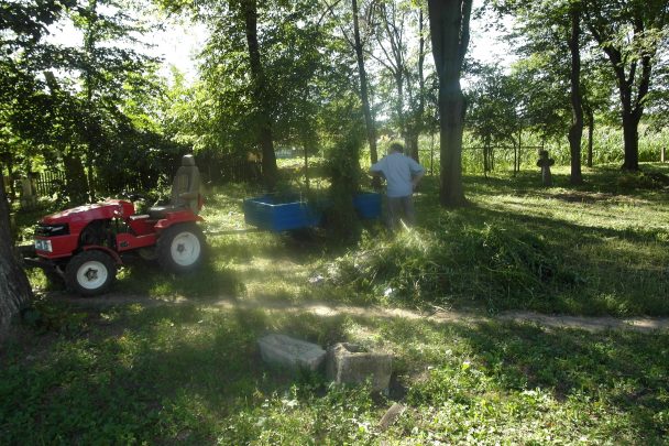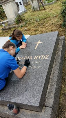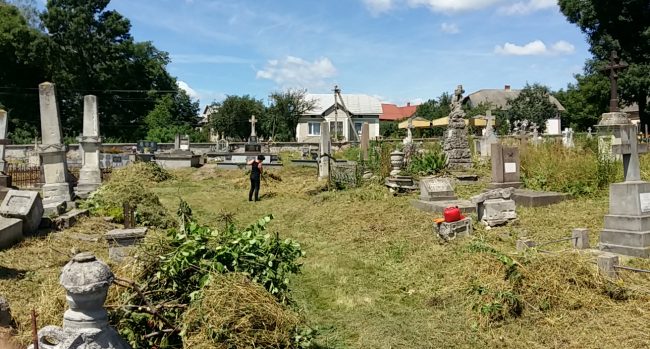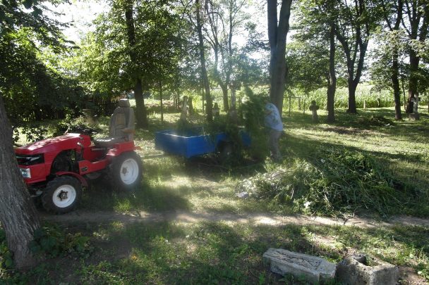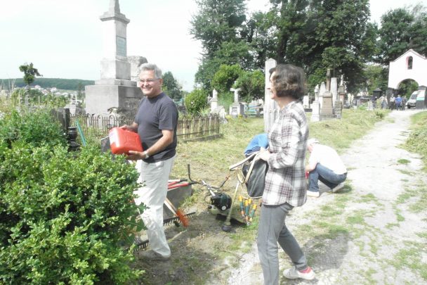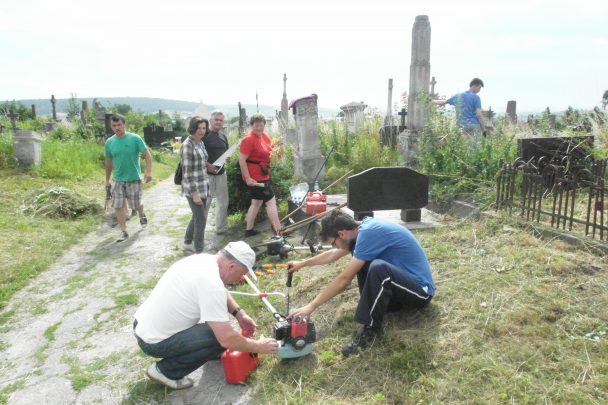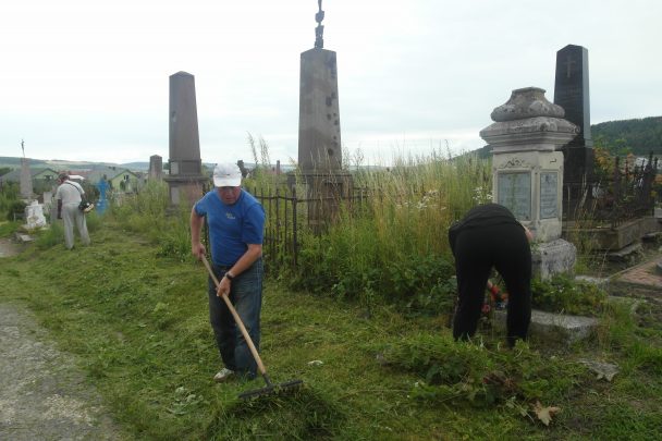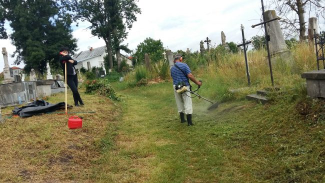 Wszyscy zaniemówiliśmy, bo zobaczyliśmy bardzo zarośnięte aleje i groby. Tak jak w ubiegłym roku, tak i w tym czekała nas mozolna praca. Przede wszystkim koszenie trawy miejscami sięgającej do pasa, wycinanie sektorami gałęzi, które zakrywały ocalałe pomniki. Pracowaliśmy wykorzystując kosiarki, trzy siekiery, kilka sztuk sekatorów i nożyc ogrodniczych, grabie i haczki. Niemiłe niespodzianki sprawiały nam mocno ukorzenione krzewy, które stały się już drzewami i wyrastały w szczelinach pomników nagrobnych. Licznych zadrapań i małych ran nabawialiśmy się, usuwając rozrośnięte gęsto krzaki jeżyn. Kryte obuwie, długie spodnie i rękawice stały się niezbędne w karczowaniu tej niechcianej roślinności.