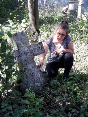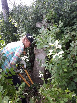 Największym jednak wyzwaniem jest cmentarz w Białym Kamieniu. Znaleźliśmy go dwa lata temu jadąc na wycieczkę do Złoczowa. Przejeżdżając przy lesie (jak nam się wtedy wydawało) wyłoniły się stare kamienne krzyże. Zgłosiliśmy ten cmentarz i już rok temu rozpoczęliśmy prace na jego terenie. Tu trzeba karczować część drzew. Tych większych nie jesteśmy w stanie usunąć, nie mamy specjalistycznego sprzętu a spadające pnie drzew mogłyby uszkodzić nagrobki.