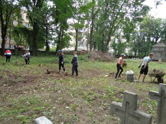 Wolontariusze z Międzylesia i Ścinawki Dolnej pracujący na cmentarzu w Kołomyi