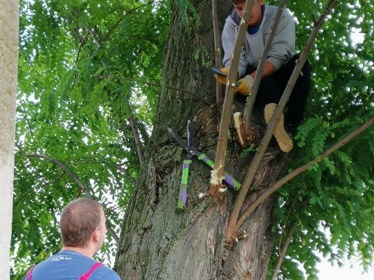 Z wielkim zapałem przystąpiliśmy do pracy. W pierwszej kolejności pozbieraliśmy wypalone znicze ( z ubiegłego roku J), zgniłą trawę oraz zajęliśmy się karczowaniem akacji. Do tego wszystkiego okazało się, że Komarno nawiedziły wielkie wichury i na terenie cmentarza leżało kilka powalonych drzew. Dzięki posiadanej pile udało nam się je pociąć na mniejsze kawałki, które zostały zabrane przez naszych polskich przyjaciół na opał.