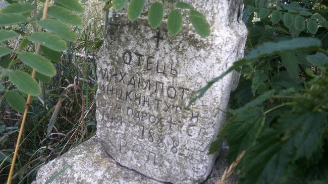 Nie zachował się natomiast przykościelny cmentarz. Udało nam się znaleźć zaledwie dwa nagrobki: z jednego nie sposób odczytać nazwisko, zaś drugi (z napisami w cyrylicy) upamiętnia księdza, którego historii niestety nie znamy. Być może inne mogiły znajdują się pod ziemią.