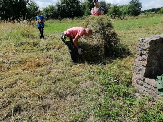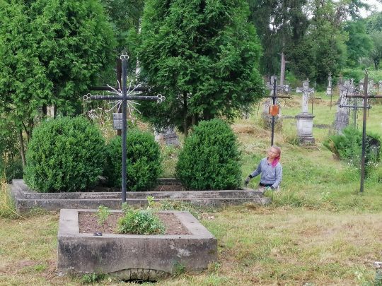 Po 12.00 skierowaliśmy się ku cmentarzowi. Teren przy kaplicy cmentarnej był skoszony, jednak pozostały obszar był zarośnięty trawą, krzakami, akacjami oraz w wielu miejscach zgniłą trawa, którą wykoszono dla krów ale potem pozostawioną na miejscu.
