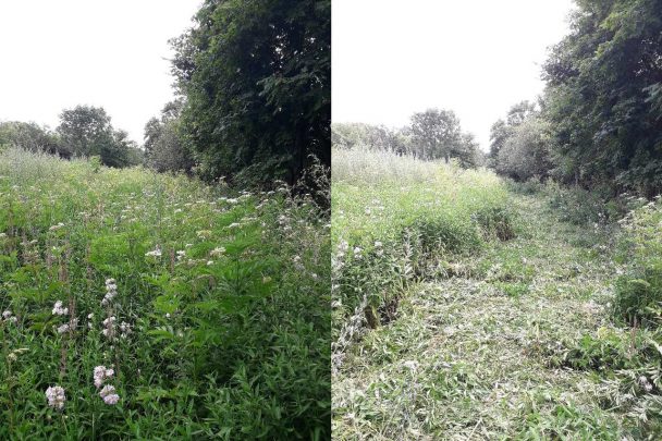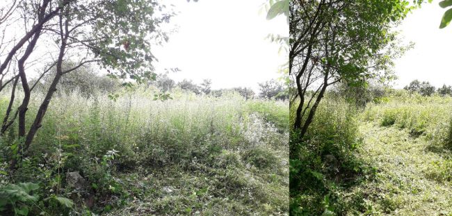 Pierwszym zadaniem było wytyczenie ścieżek wśród gąszczu , dzięki którym mogliśmy się bez problemu poruszać po cmentarzu ze sprzętem oraz karczować drogę do konkretnych pomników. Jedynie wokół kaplicy postanowiliśmy wykarczować cały teren od razu. Zieleń jest problemem co roku. Każdego roku kosimy i karczujemy, lecz co roku wszystko odrasta bez pielęgnacji całorocznej. Jedyną zaletą jest usunięcie w wykoszonym miejscu pniów, kamieni i gałęzi, co ułatwia prace w następnych latach. Przyda się też znajomość terenu, nabyta w latach poprzednich.