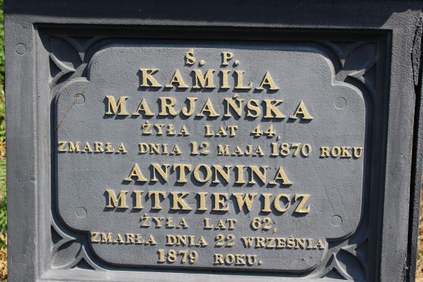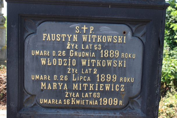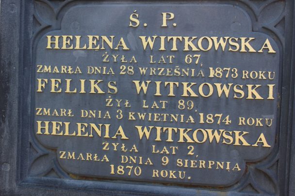 1.Ś.P Helena Witkowska (żyła lat 67,zmarła dnia 28.09.1873r) Feliks Witkowski (żył 89lat, zmarł 3.04.1874r.) Helenia Witkowska (żyła 2lata, zmarła 9.08.1870r) Kamila Marjańska (żyła lat 44, zm 12.05.1870r) Antonina Mitkiewicz (żyła lat 62, zm 22.09.1879r) Faustyn Witkowski (żył 53lat, zm. 26.12.1889r) Włodzio Witkowski (żył 2lata, zm 26.07.1899r) Marya Mitkiewicz (żyła 63lata, zm 16.04. 1909r)