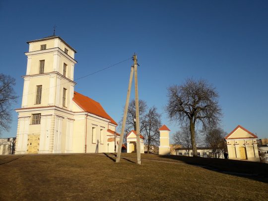 Pierwszym elementem, który opisywał Pan Zagłoba był kościół farny. Znajduje się on na drugim brzegu, niż centrum miasta, Nieświaży. Jest on pod wezwaniem Św. Jerzego. Rzeczywiście swoim rodowodem sięga głębokiego gotyku, lecz jego późniejsze przebudowy – szczególnie w II p. XIX w. i okresie międzywojennym trochę go zmieniły.
