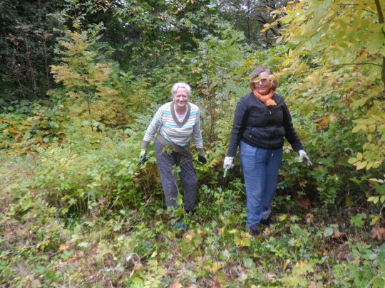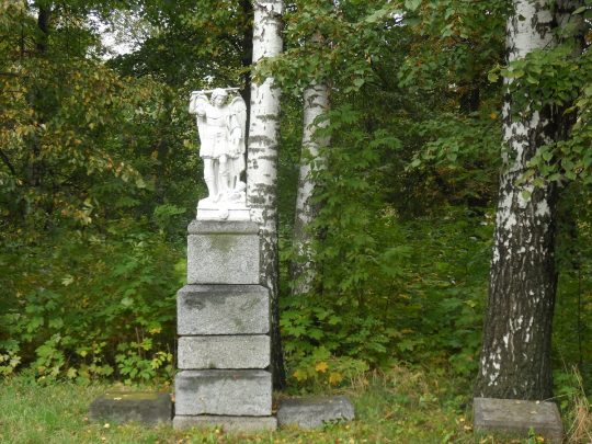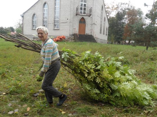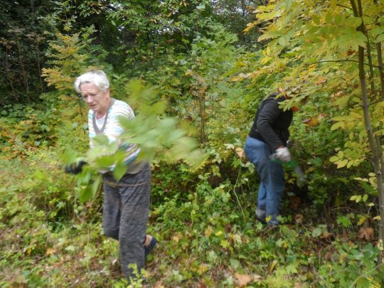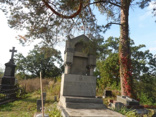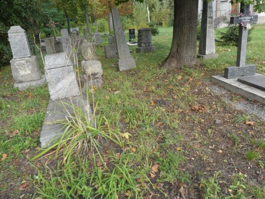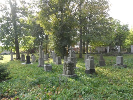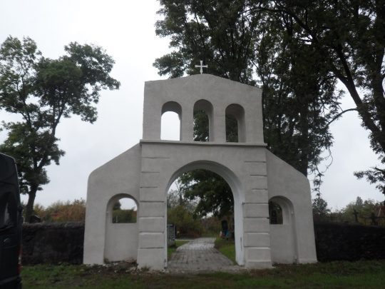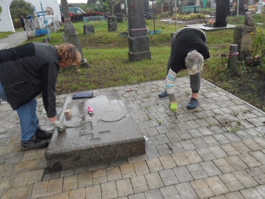 Drugą nekropolią, którą porządkowaliśmy, był cmentarz w Koziatynie. Niestety, pogoda już nam nie sprzyjała – na przemian padało i mżyło, co nie pozwoliło nam w pełni wykorzystać czasu na zaplanowane prace. Niemniej jednak, udało nam się odmalować kilka napisów na nagrobkach, a także wyciąć znaczną ilość splątanych samosiejek, które zakrywały leżące w ziemi pomniki. Niestety, nie starczyło nam już jednak czasu na wycięcie wszystkich chaszczy. Miłym akcentem prac na cmentarzu była pomoc młodzieży i ich opiekunów z koziatyńskiego zespołu „Podolski kwiat”.