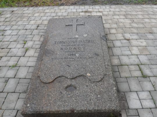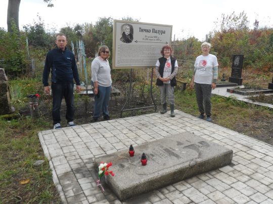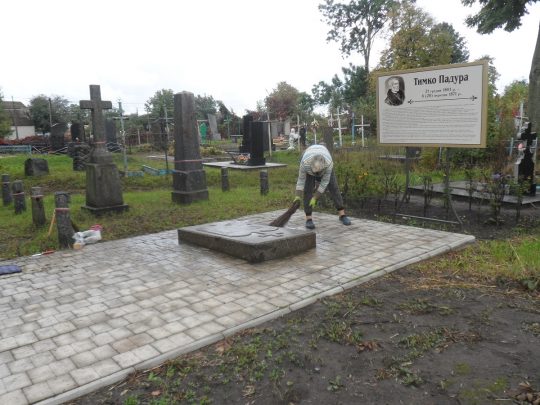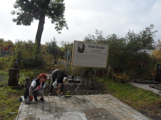 Na porządkowanie trzeciej nekropolii pozostał nam tylko jeden dzień, dlatego też nasze prace porządkowe na cmentarzu w Machnówce skoncentrowały się głównie na grobie Tymona Padury (autora pieśni „Hej, sokoły”) oraz jego otoczenia. Oczyściliśmy z chwastów wykładaną płytkami ścieżkę wiodącą do tego grobu oraz okoliczne groby. Po wyszorowaniu płyty nagrobnej pochowanego tu pieśniarza i poety, złożyliśmy na niej wiązankę biało-czerwonych tulipanów, a następnie zapaliliśmy znicze. Miłym zaskoczeniem dla nas była sypiąca się ze starości rok wcześniej, a teraz już wyremontowana główna brama cmentarna. Niespodzianką była także nowo postawiona tablica przy grobie T.Padury, upamiętniająca postać tego poety. W Machnówce spotkaliśmy się także z tamtejszym, polskim księdzem – Janem Dziatkiewiczem, który zaprosił nas na smaczny i obfity poczęstunek.