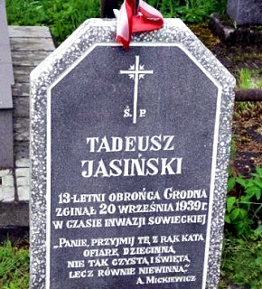 Symboliczny grób Tadka Jasińskiego, 13-letniego chłopca, który został schwytany przez czerwonoarmistów, gdy bezskutecznie próbował zniszczyć rosyjski czołg „koktajlem mołotowa”. Sołdaci przywiązali go do pancerza czołgu jako żywą tarczę! Został kilkukrotnie ranny, cudem odbity przez rodaków, zmarł w szpitalu na rękach matki. Ten najmłodszy obrońca Grodna jest patronem jednego z bulwarów we Wrocławiu. W 2009 r. został pośmiertnie odznaczony Orderem Virtuti Militari.