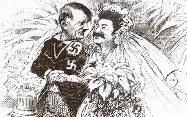 Karykatura przedstawiająca pakt Ribbentrop-Mołotow, jako pożenionych Hitlera i Stalina.