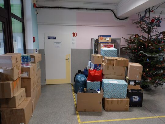 Kolejny dzień to wyjazd do szkoły w Dunajowie. Tradycyjne powitanie chlebem, wypakowanie darów i najważniejszy moment – przybycie Mikołaja z paczkami świątecznymi i życzeniami od rówieśników z kudowskich szkół. Największą nagrodą, rekompensującą trudy wyjazdu, jest uśmiech i radość na twarzach dzieci i młodzieży oraz nauczycieli. W trakcie tego spotkania rozległ się przeraźliwy dźwięk alarmu przeciwlotniczego, brutalnie przywracający nas do wojennej rzeczywistości. Rozpakowane w schronie paczki ponownie wywołały uśmiech i radość.