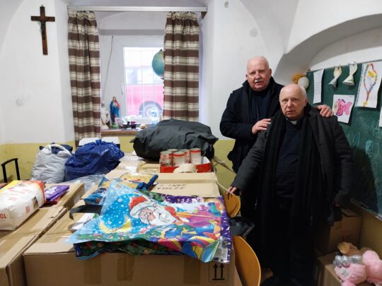 Kolejny raz w okresie świątecznym zorganizowaliśmy akcję wspierającą Polaków na Kresach oraz uczniów zaprzyjaźnionej szkoły w Dunajowie. I po raz kolejny mieszkańcy Kudowy-Zdroju okazali wielkie serce, empatię, zaangażowanie i życzliwość. Włączyli się do działań uczniowie kudowskich szkół, ich rodzice, księża proboszczowie, osoby prywatne. Bezcenna okazała się pomoc Pani Burmistrz i Radnych naszego miasta. Włączyli się do pomocy również uczniowie szkoły w Lewinie Kłodzkim i ksiądz proboszcz z tej miejscowości. Bazę dla akcji stanowiły pomieszczenia w Zespołu Szkół Publicznych przy ulicy Szkolnej. Wolontariusze posegregowali produkty, zrobili paczki i je opisali. Mając pełny bus darów, z życzeniami pomyślności od władz miasta, wyruszyliśmy na Ukrainę. Dotarliśmy do Przemyślan, powiatowego miasta położonego 50 km od Lwowa. Jest to miejscowość o bogatej historii. Prawa miejskie uzyskała w 1623 roku. Odwiedziliśmy księdza Piotra Smolkę, salezjanina, proboszcza parafii pw. Świętych Apostołów Piotra i Pawła. Ten kapłan daje wspaniały przykład chrześcijańskiego miłosierdzia. Zabiega o naszych rodaków, wspiera ich na różne sposoby, odzyskuje i remontuje kościoły, wzorowo pracuje z dziećmi i młodzieżą. Tu trafiła pierwsza transza naszej pomocy. Z kolędą „Wśród nocnej ciszy” udaliśmy się z wizytą do Pana Stanisława Krutnika, 90-letniego emerytowanego nauczyciela, Polaka „z krwi i kości”. Wzruszenie, łzy, ale i radość towarzyszyły temu spotkaniu. Trzeźwy, analityczny sposób myślenia, piękna polszczyzna, znajomość historii i współczesności charakteryzują tego niezwykłego człowieka. Przekazaliśmy dary i życzenia od klasy IV B i wychowawcy Daniela Dubaniewicza, którzy objęli patronat nad Panem Stanisławem. Byliśmy również gośćmi mera miasta Aleksandra Zozuli. Przyjacielskie, serdeczne spotkanie ułatwiała doskonała znajomość języka polskiego przez włodarza miasta.