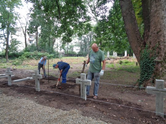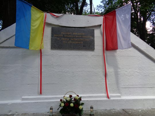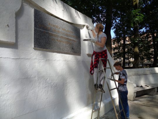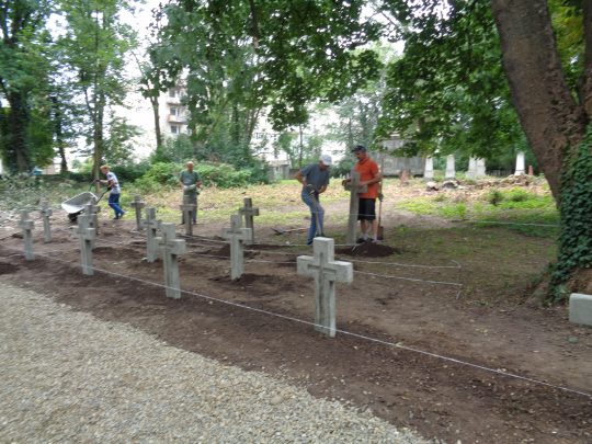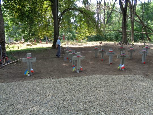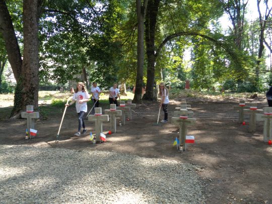 W tym roku nasza praca przebiegała inaczej. W związku z tym, że do porządkowania cmentarza włączyło się miasto i usunęło zielsko oraz chaszcze, my mogliśmy skupić się na innej pracy. Naszym miejscem pracy był obszar wokół pomnika postawionego Polakom zmarłym w latach 1918-1919 w obozie w Kosaczowie, gdzie zginęło z powodu chorób, zimna lub zostało rozstrzelanych kilka tysięcy polskich działaczy niepodległościowych i społecznych. Prace polegały na uporządkowaniu terenu, wydobyciu z ziemi krzyży i ponowne ich postawienie. Odświeżyliśmy także pomnik oraz krzyż. Finałowym efektem naszej pracy było ponowne wkopanie około 40 krzyży, udekorowanie ich polskimi symbolami, oddanie czci zmarłym oraz zapalenie zniczy i złożenie wiązanki na płycie pamiątkowej pomnika.