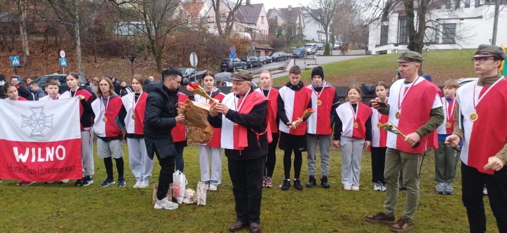 Z tym właśnie zastępami harcerzy połączyliśmy siły dnia następnego, bardzo wczesnym rankiem 11 listopada, wyruszając w XXXI Sztafecie Niepodległości na etapie Zułów – Niemenczyn – Wilno Cmentarz na Rossie. W ten oto sposób niezmiennie od 31 lat nasi młodzi Rodacy z Polski i Litwy świętują najważniejsze narodowe święto. Sztafeta zakończyła się na wileńskiej Rossie, gdzie odbyły się uroczystości z okazji 107 rocznicy Odzyskania Niepodległości. Deszczowa pogoda nie przeszkodziła w realizowaniu założonego programu i uczestniczeniu w tych pięknych patriotycznych wydarzeniach. Na pytania skierowane do naszych Rodaków mieszkających na Litwie, jak im się obecnie żyje, odpowiadali, że żyją skromnie, ale uczciwie, tu na tej litewskiej ziemi, która jest ich ojczyzną, nie zapominając jednak o Polsce, którą nazywają swoją Macierzą.
