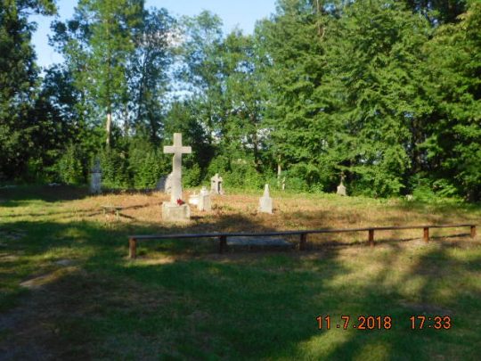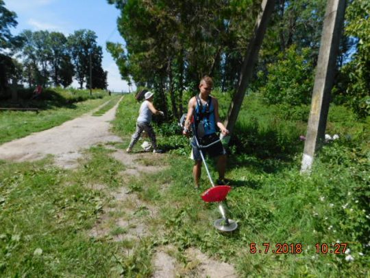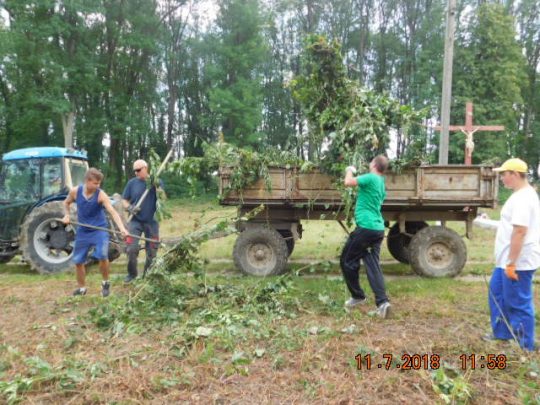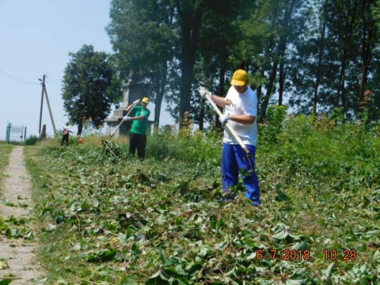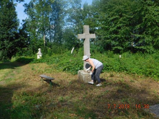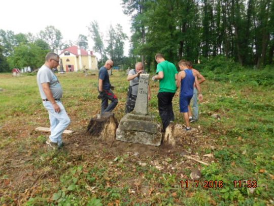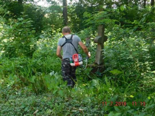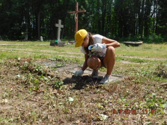 Prace porządkowe rozpoczęliśmy od czwartku (5.07.) i trwały one aż do środy (11.07.). Po dotarciu na miejsce zastaliśmy porośniętą wysokimi chaszczami łąkę, z której nieśmiało wynurzały się krzyże grobów naszych przodków. Cmentarz był tak zarośnięty, że aż trudno było uwierzyć, iż w ubiegłym roku wolontariusze równie ciężko tu pracowali i oczyścili dużą część terenu. Nie zwlekając ochoczo zabraliśmy się do pracy. Wysoka temperatura powietrza utrudniała nam wykonywanie przydzielonych zadań, lecz cel naszej akcji motywował nas do zwiększonego wysiłku. W pierwszej kolejności należało wyrwać i wyciąć krzaki, wykosić trawę, powój i inne chwasty – niektóre z nich osiągały wysokość jednego metra lub były jeszcze wyższe. To zadanie należało do męskiej części naszej ekipy. Zadaniem kobiet było usuwanie na bieżąco ściętych zarośli. Późnym popołudniem można było zobaczyć pierwsze efekty naszej pracy – część odsłoniętych pomników i napisów na mogiłach.
