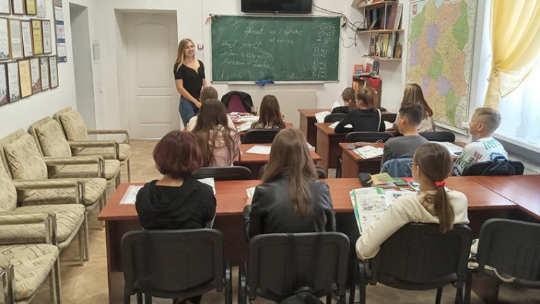 W zeszłym tygodniu po raz pierwszy od dłuższego czasu w szkolnej klasie pojawiło się dawne życie. Szkoła języka polskiego przy SKP imienia Ewy Felińskiej oferuje obie formy kształcenia: naukę stacjonarną oraz zdalną. W przypadku nauki stacjonarnej, uczniowie polskiej szkoły mają zapewnione schronienie w gmachu Wołyńskiego Teatru Muzyczno-Dramatycznego w razie alarmów przeciwlotniczych.