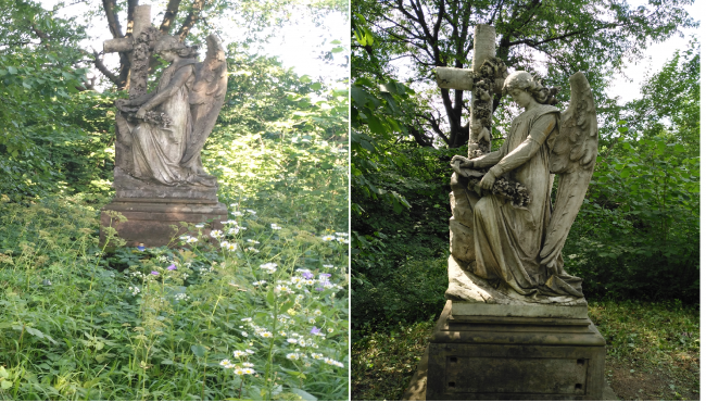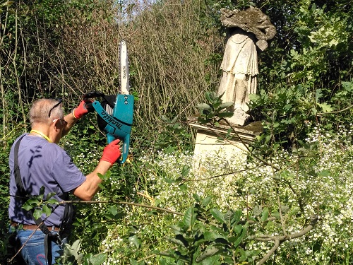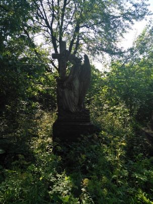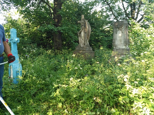 Pracę rozpoczęliśmy od wyczyszczenia miejsca, w którym stoi anioł i pomnik. Chłopcy niezwłocznie przystąpili do wycięcia chaszczów, które go otaczały, natomiast dziewczęta zabrały się za czyszczenie posągów. W trakcie pracy udało nam się odsłonić napis na posągu oraz tablicy. Ponadto po wykoszeniu trwa odkryliśmy olbrzymią dziurę, która znajdowała się u szczytu pomnika i odsłaniała, jak się okazało grobowiec rodu Theodorowiczów.