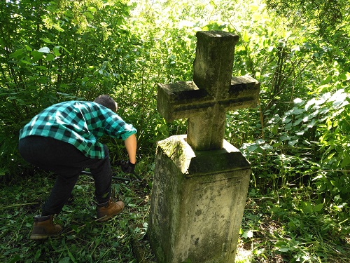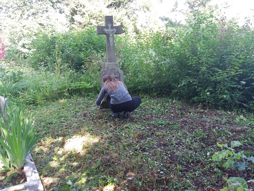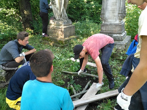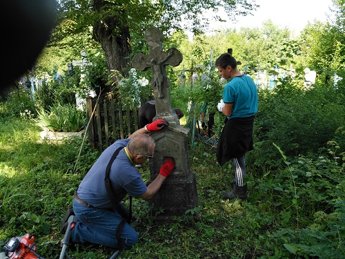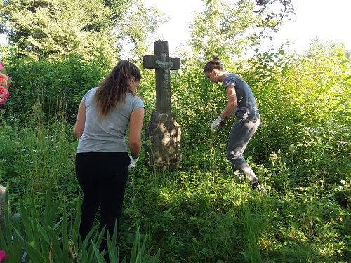 Męska część ekipy niezwłocznie zasłoniła wejście do grobowca deskami, które zorganizowali ukraińscy chłopcy, a następnie przysypała je ziemią i oznaczyła postumentem znalezionym obok pomnika. Później młodzież z dużym zaangażowaniem oddała się pracom porządkowym przy kolejnych nagrobkach. Dziewczęta nieustannie penetrowały teren w poszukiwaniu polskich mogił. Wśród roślinności udało nam się wyszukać groby, na których widniały polskie napisy. Przy niektórych z nich roślinność przewyższała wzrost uczniów, więc aby do nich dotrzeć musieliśmy najpierw utorować sobie drogę, wycinając krzaki i chaszcze. Następnie usuwaliśmy mech porastający pomniki, by w końcu zająć się oczyszczeniem napisów papierem ściernym.